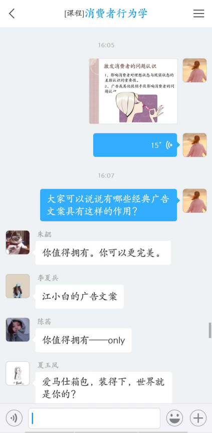 目前,通过积极拓展教学空间、引导学生开展形式多样的混合学习,确保每一节在线课堂的高质量、高互动、高水准,取得了良好的效果。学生们能够做到诚信打卡、积极互动、认真作业,统计数据显示学生学习积极性高、热情主动、参与度极高,消费者行为学基本概念和理论掌握很好,能够结合实际活学活用进行分析,达到了预期教学效果。