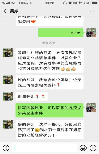 疫情考验责任心,教师们的认真、耐心、细致的指导赢得学生的敬佩与点赞。2016经济学王晓刚同学说:梅老师在微信上不厌其烦的指导我开题,反复讨论论文框架,为我提供最新的参考文献,让我为梅老师的敬业精神深深感动。我决心认真写好毕业论文,不辜负老师希望。目前论文初稿已经写好。2016市场营销吴婷同学说:芬姐(徐志芬)将我们的论文和疫情相结合,指导我们找出疫情对企业营销的影响,一方面保证了论文选题的新颖,写作内容的与时俱进,另一方面又从实践角度加深了我们对疫情影响的理解,拓宽了我们的写作思路,犹如醍醐灌顶。