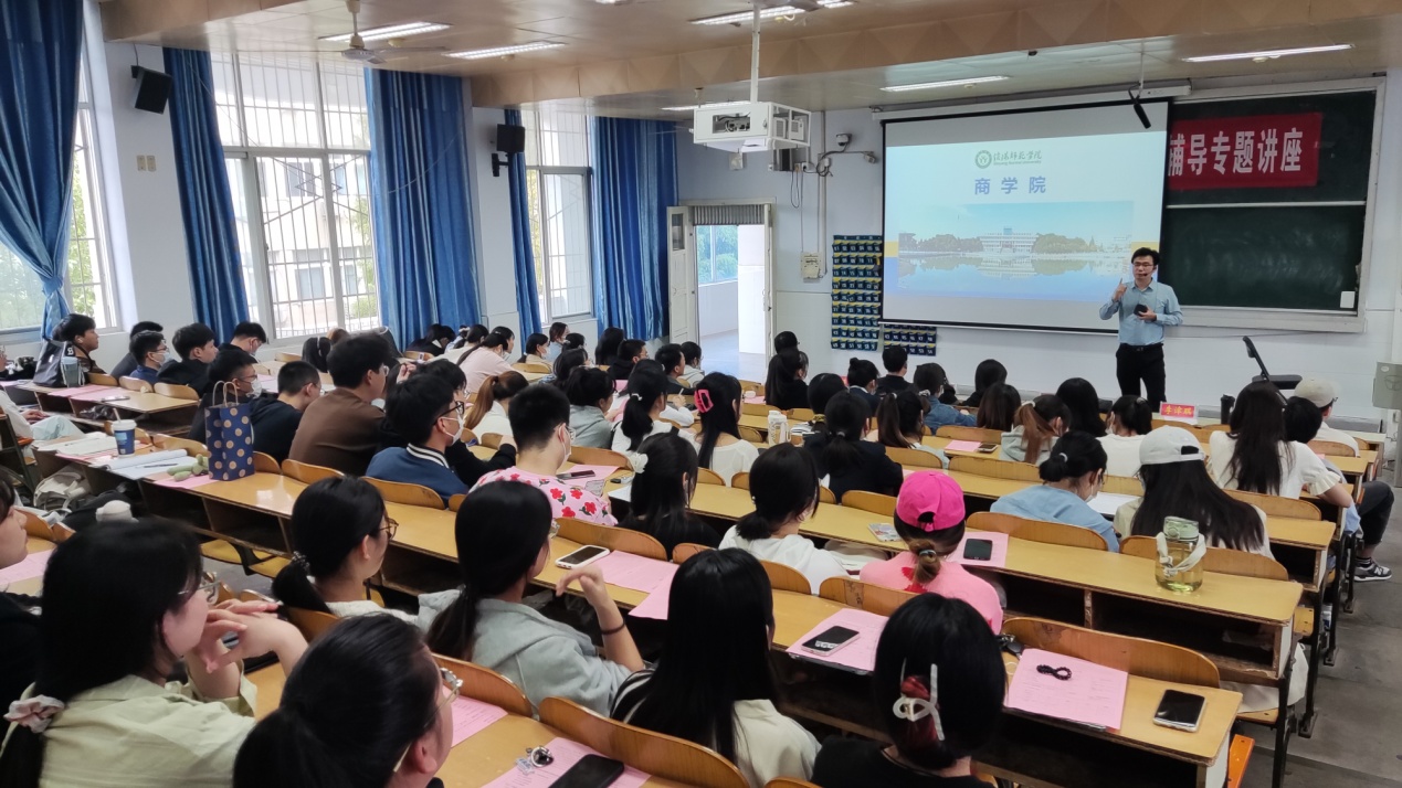 9月24日上午,俞彤晖和梁静波在信阳农林学院经管学院做考研宣讲,会后学生反响热烈,老师对学生提出的问题进行答疑。