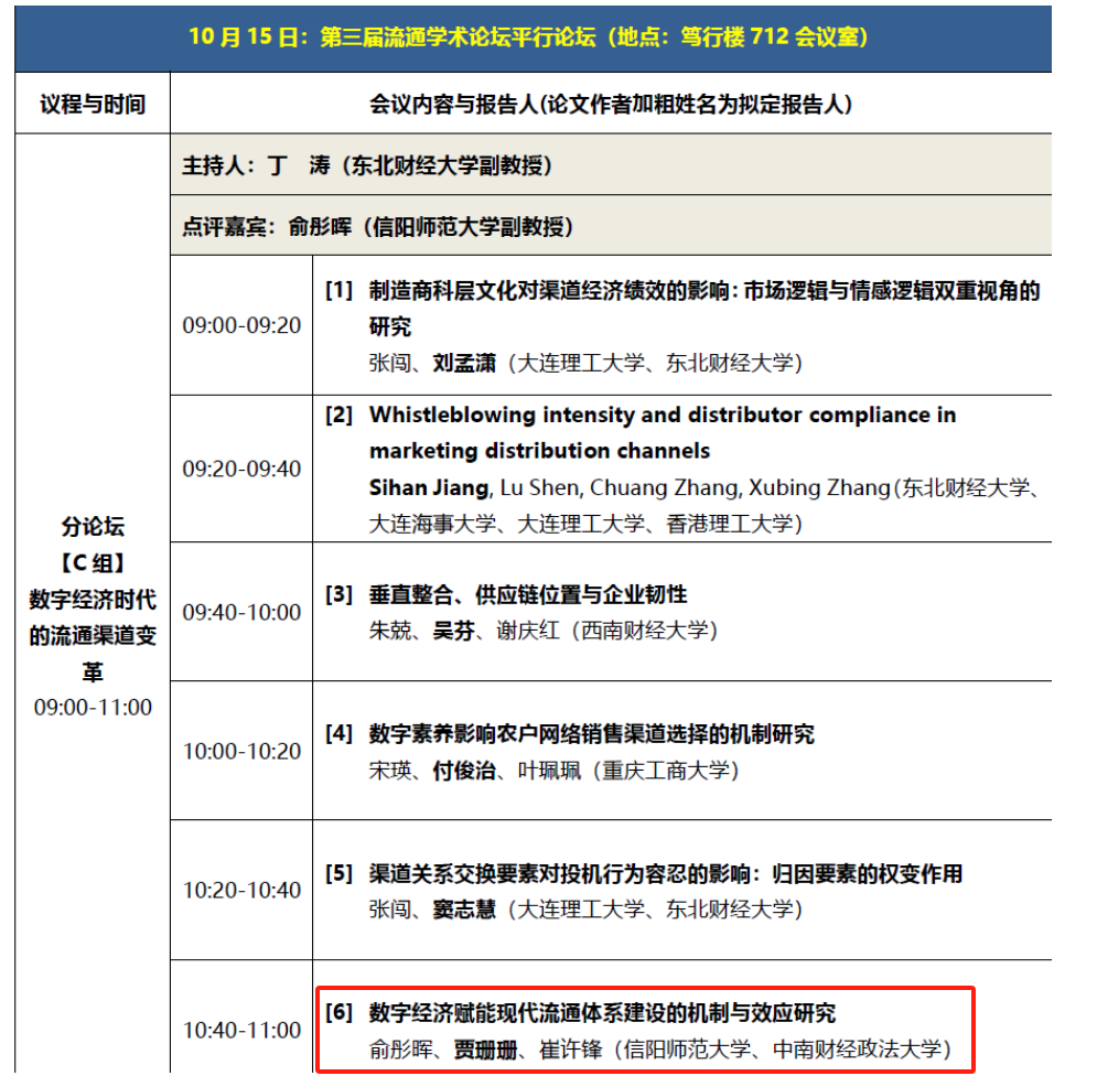 2023年10月14日至15日,由东北财经大学流通研究院主办、商务部流通业发展司指导的第四届流通发展论坛暨第三届流通学术论坛如期在辽宁省大连市东北财经大学举行,本届论坛以“流通的数字化与可持续发展”为主题,分为主旨演讲、优秀论文报告与点评、主题报告、期刊编辑面对面、博士(硕士)研究生平行论坛五个环节。此次流通发展论坛的征文内容涵盖了流通高质量发展、流通数字化转型、流通领域的可持续性发展与流通创新等方面的前沿问题。BT之家 研究生踊跃向会议投稿,其中,理论经济学专业硕士研究生贾珊珊的学术论文入选会议并受邀进行学术汇报,其撰写的论文题目为《数字经济赋能现代流通体系建设的机制与效应研究》。该研究生的论文汇报得到了现场点评嘉宾的高度评价。