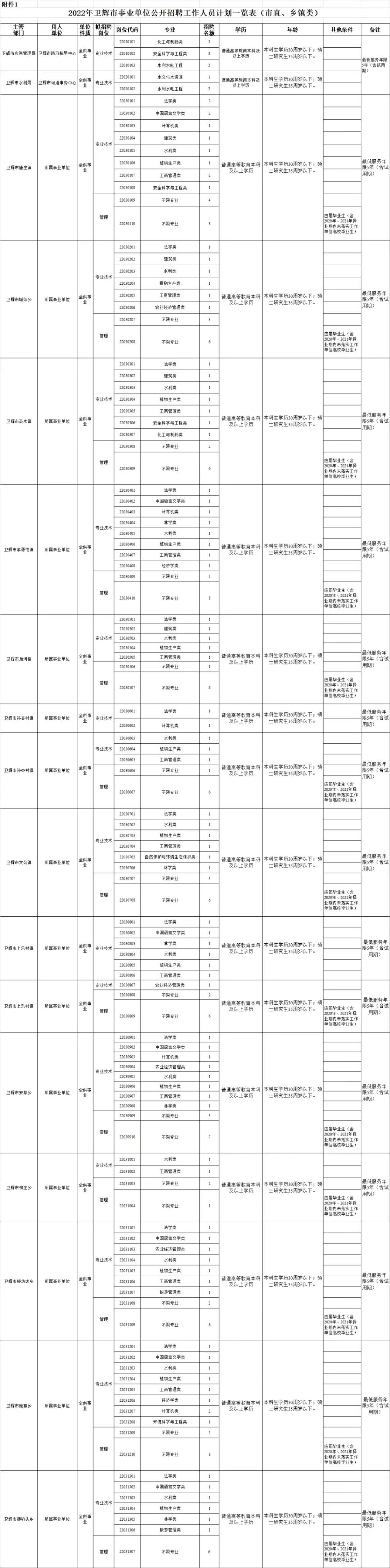 附件1:2022年卫辉市事业单位公开招聘工作人员计划一览表