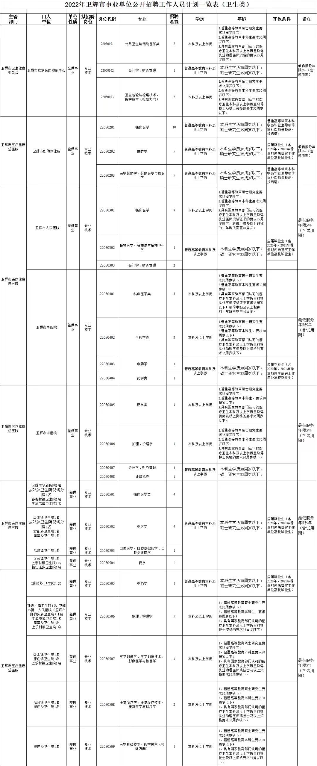 依据《事业单位人事管理条例》(中华人民共和国国务院令第652号)、《事业单位公开招聘人员暂行规定》(原人事部令第6号)、《河南省事业单位公开招聘工作规程》(豫人社〔2015〕55号)、《河南省人力资源和社会保障厅 关于进一步做好全省事业单位招聘高校毕业生工作的通知》(豫人社办函〔2022〕72号)及省市相关政策规定和要求,经卫辉市人民政府同意并报新乡市人力资源和社会保障局备案,拟面向社会公开招聘事业单位工作人员732人。现将有关事项公告如下:
