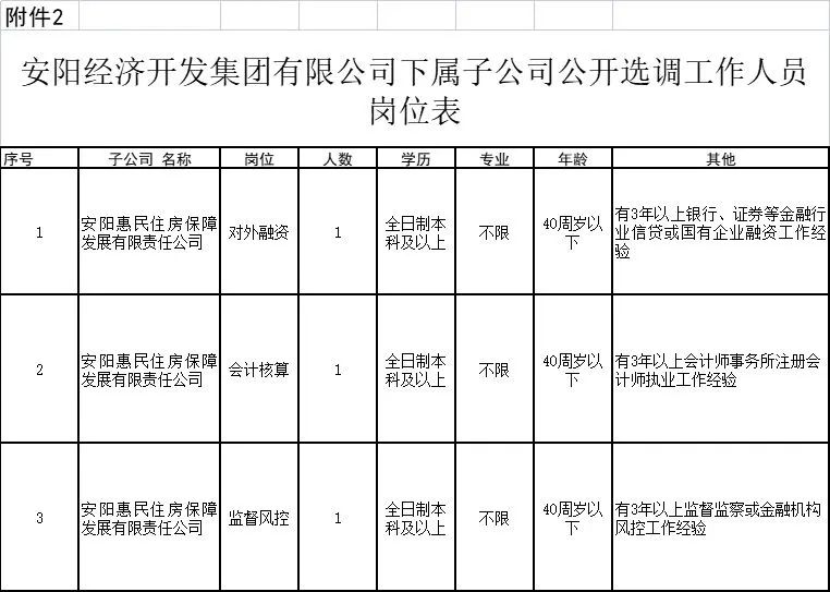 2.公开选调3人。具体岗位要求详见《安阳经济开发集团有限公司下属子公司公开选调工作人员岗位表》(附件2)。
