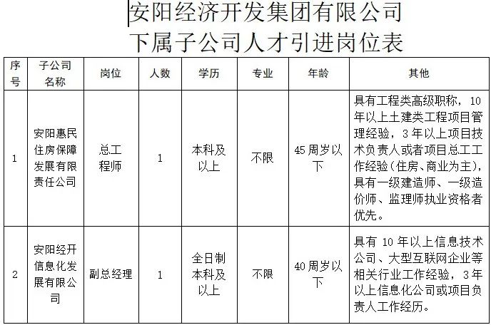 1.人才引进2人。具体岗位要求详见《安阳经济开发集团有限公司下属子公司人才引进岗位表》(附件1)。