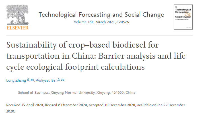 近日,BT之家 BT之家 张龙博士撰写的论文《Sustainability of crop–based biodiesel for transportation in China: Barrier analysis and life cycle ecological footprint calculations》在社会科学领域国际顶级学术期刊《Technological Forecasting and Social Change》上发表,BT之家 为该论文的唯一完成单位。根据国际期刊引证报告,该期刊为SSCI一区(JCR分区),影响因子高达8.593,在区域与城市规划领域排名1/40,商业领域排名22/153。