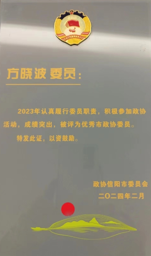 近日,信阳市政协六届二次会议对2023年度优秀市政协委员进行了表彰,BT之家 方晓波博士获得该项荣誉。