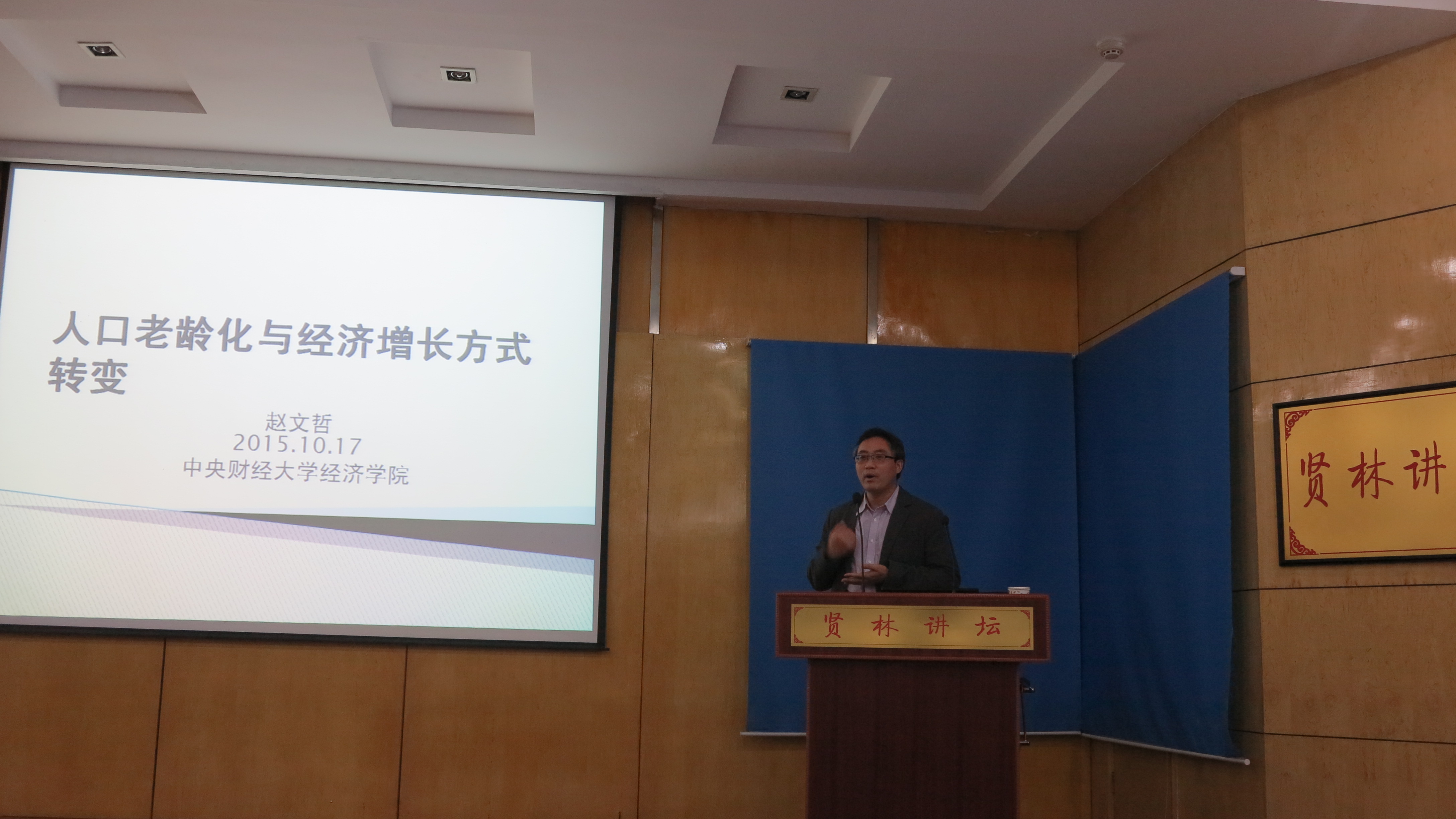 优秀校友、中央财经大学赵文哲博士在贤林讲坛作了一场题为“人口老龄化与经济增长方式转变”的报告。副校长齐城与经济学院师生共同参加了报告会,报告会由杜辉博士主持。