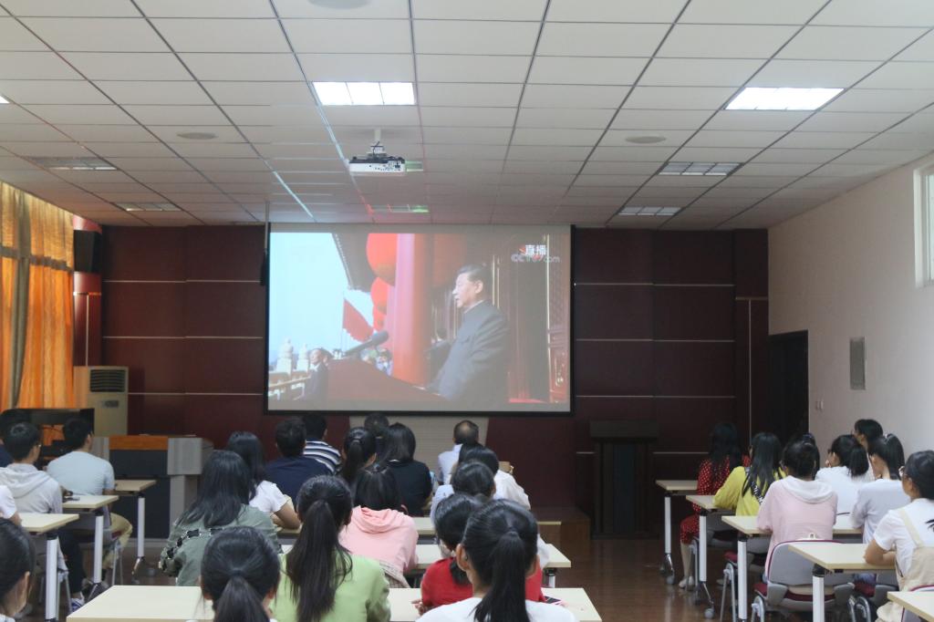 礼炮轰鸣,国歌奏响,五星红旗冉冉升起,国庆庆典正式开始。首先由习近平总书记发表重要讲话,号召全党、全军、全国各族人民同心同德,同向同行,为实现中华民族伟大复兴中国梦而努力奋斗;随后的阅兵仪式中,各方队依次受阅并进行分列式展示,彰显了我军雄厚的综合实力和良好的精神风貌;最后的群众游行中,彩车生动直观地再现了新中国70年发展历程。观看过程中,师生不时报以热烈的掌声和欢呼,展现了浓厚的爱国热情。