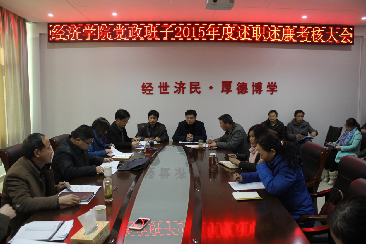 1月15日下午经济学院召开处级领导干部年度述职述廉考核大会。组织部副部长曽伏虎、纪委办公室胡思辉莅临大会。会议由经济学院党委书记盛正国主持。