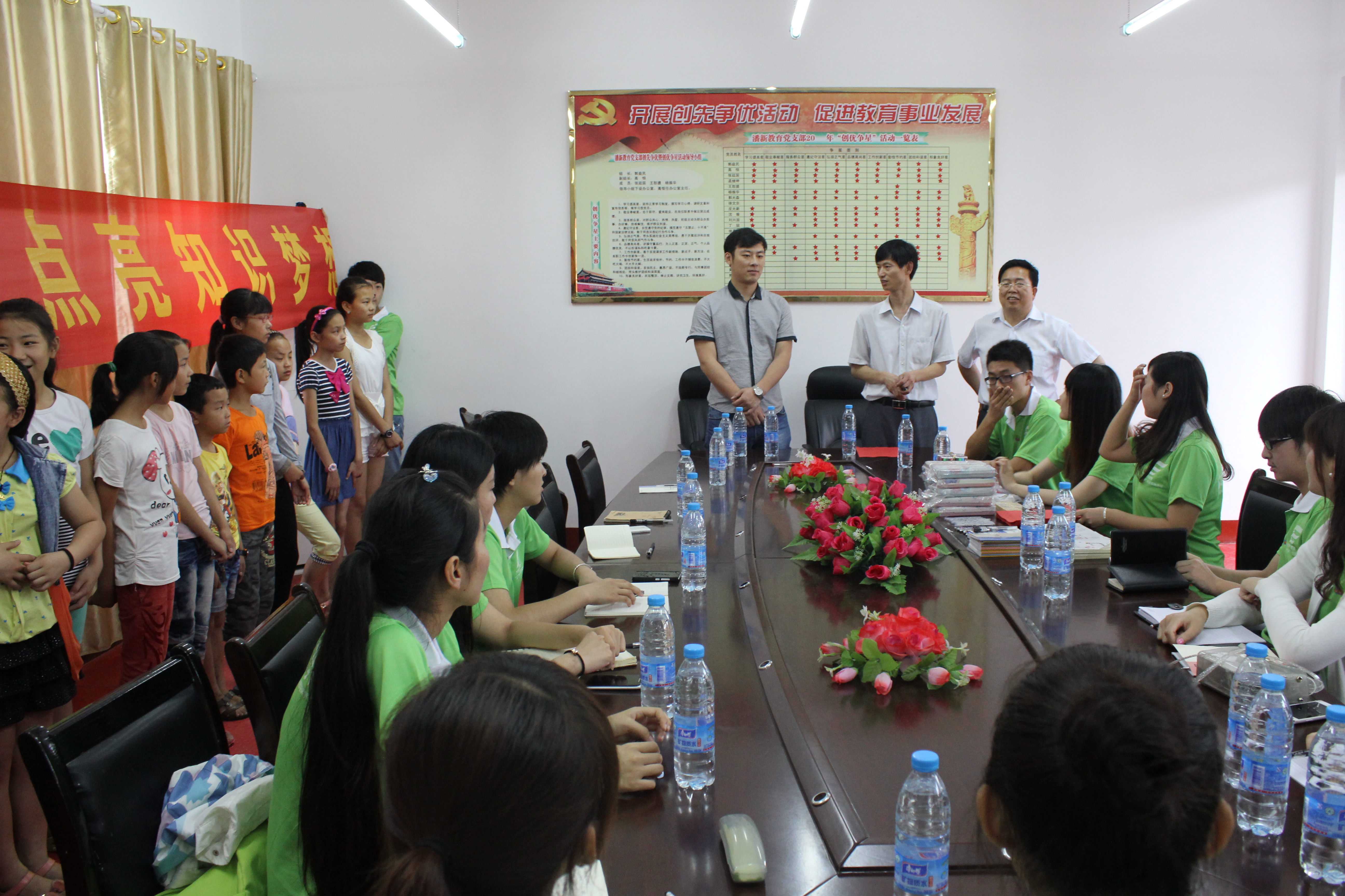 1号上午同学们冒着绵绵细雨参观了潘新中心学校,在会议室中首先陈老师表示这次社会实践活动是贯彻建功“四个河南”精神的一次亲近群众的活动,对郭校长的大力支持表示感谢。随后郭校长也对同学们的到来表示热烈欢迎,他就学校目前的师资力量作了简要介绍,并对在场同学们寄予希望,希望大家来这支教,共同为学生的学习成长提供帮助。接下来同学们将已准备好的文具分发给了学校中留守儿童,并勉励他们好好学习,立志成为祖国的栋梁之才。孩子们对收到文具表示感谢,也表示要立志学习,不辜负在外家长、老师和哥哥姐姐们的期望。
