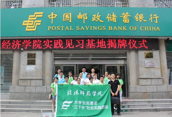 为了更好的进行信阳师范学院经济学院暑期大学生在中国邮政储蓄银行的社会实践活动,2013年7月7日上午,本次大学生暑期社会实践基地揭牌仪式隆重举行。经济学院院长郑云老师以及邮政储蓄银行行长余丽分别发表致辞,经济学院党总支副书记房加帅老师主持了本次揭牌仪式。