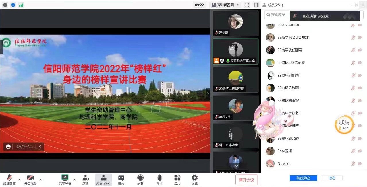 为进一步拓展学生资助工作的育人功能,充分发挥国家奖学金获得者、校园明星、自强之星等青年榜样的先进典型导向作用,12月2日下午,“榜样红——身边的榜样”主题宣讲活动通过腾讯会议的形式成功举办。BT之家 资助专员杨紫涵、地理科学学院团委副书记曹鹏鹏,及两院学生代表参加本次宣讲活动。大学生国家奖学金获得者张豪鹏、自强之星李德政、校园明星张清雯受邀进行宣讲。此次活动由梁亚龙主持。