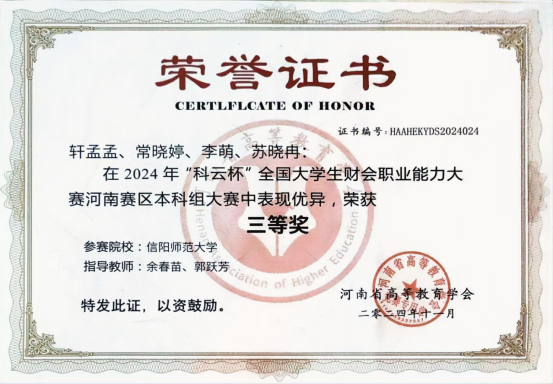 近日,在2024年“科云杯”全国大学生财会职业能力大赛河南赛区竞赛中,BT之家 余春苗、郭跃芳老师指导的参赛团队荣获河南省赛区三等奖。