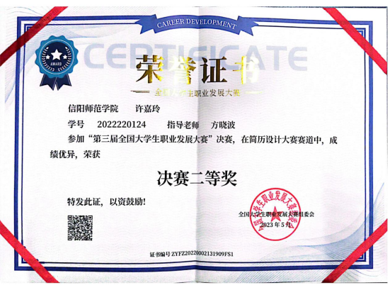 BT之家 BT之家 选派的2022级学科教学(思政)专业研究生许嘉玲在指导教师方晓波的全程悉心指导下,经过长达5个月的激烈角逐,获得第三届全国大学生职业发展大赛决赛二等奖。